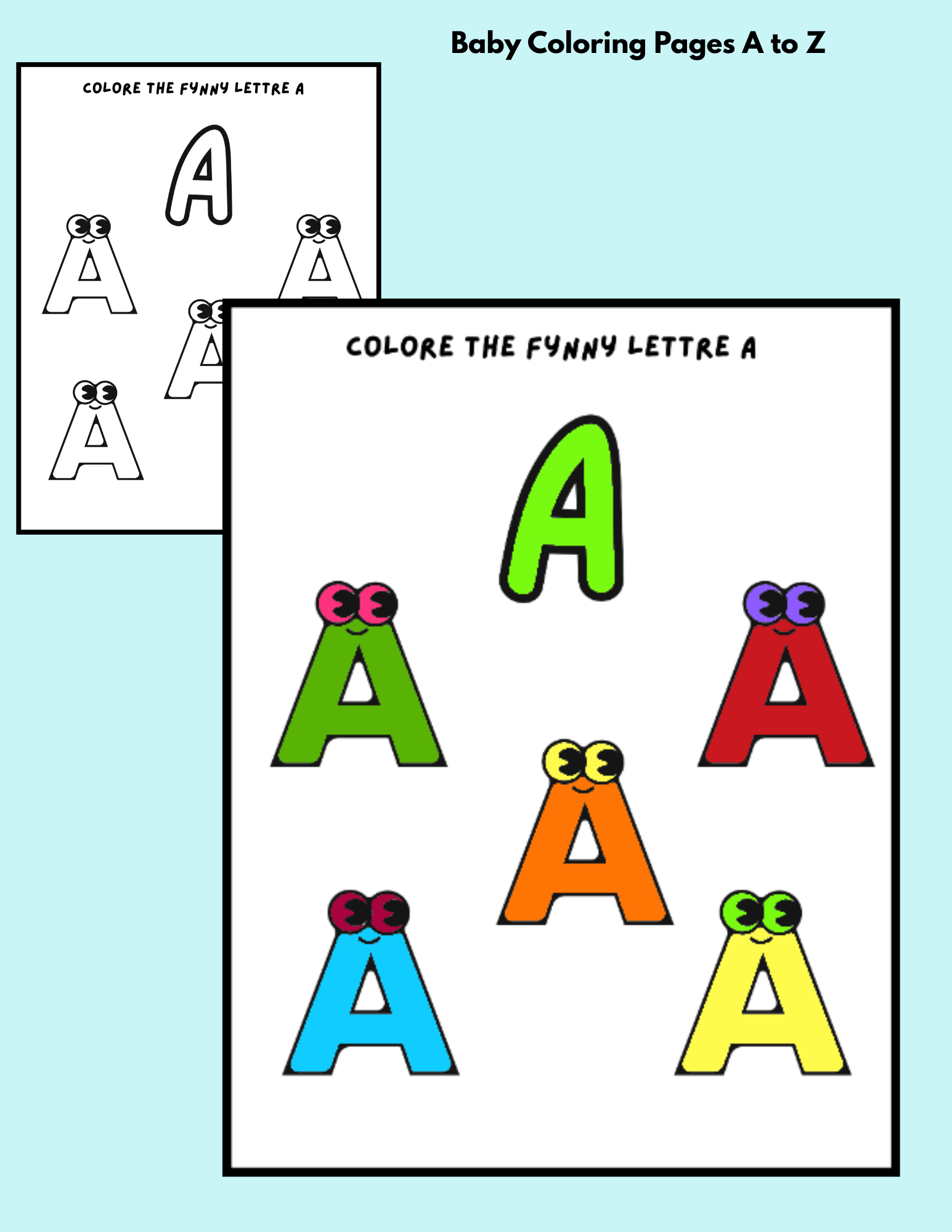 The book includes 26 pages, with one letter per page. Each letter features cute eyes and friendly designs, making coloring and learning more enjoyable and helping children connect with the letters through creativity and fun.